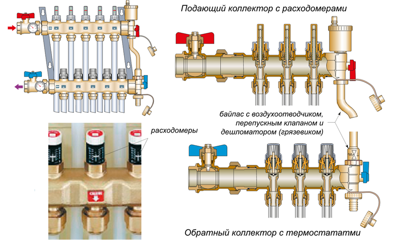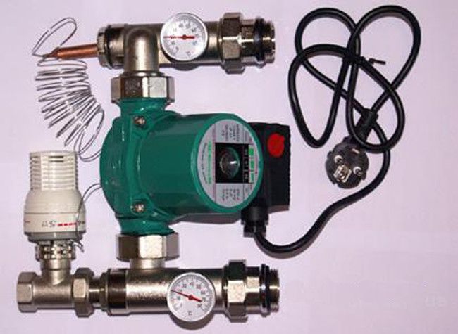 Un élément supplémentaire, mais non obligatoire, dans la fabrication d'un collecteur de chauffage est une unité de mélange. Il relie les tuyaux d'entrée et de retour du chauffage, et une vanne à deux ou trois voies est installée pour réguler le pourcentage d'eau chaude et froide. Il est contrôlé par un servomoteur qui reçoit les signaux d'un capteur de température. Si le degré d'échauffement du liquide de refroidissement est élevé, le débit d'eau refroidie augmente.
