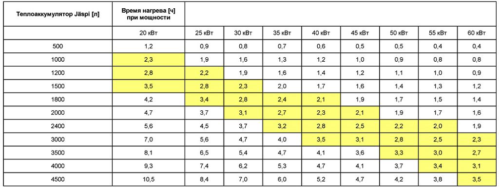 Il reste maintenant à calculer le temps de chauffage de l'eau dans le récipient. Hélas, il n'y a pas de formule universelle pour cela. Il existe une grande dépendance aux caractéristiques de performance d'un modèle particulier d'accumulateur pour le système de chauffage. Mais ces données peuvent être extraites des instructions ou sur le site Web du fabricant. A titre d'exemple, on peut considérer la dépendance de la vitesse de chauffe du ballon de stockage Wirbel de différentes capacités sur la puissance de la chaudière.