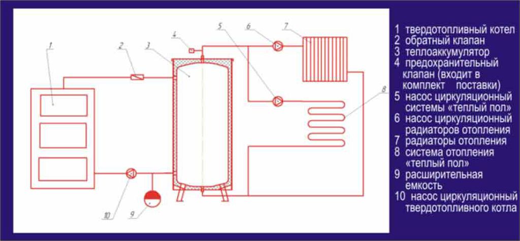 - Emplacement dans le système... Le rendement le plus élevé n'est atteint que pour un circuit de chauffage avec un accumulateur de chaleur, qui est installé immédiatement après la chaudière. Le transfert de chaleur sera alors optimal.