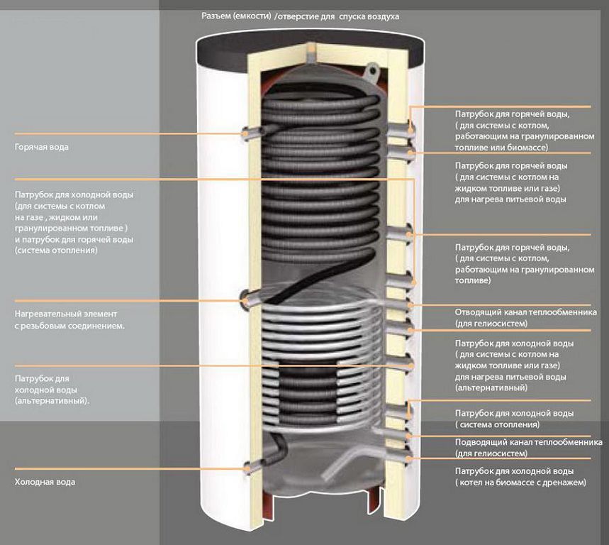 Pour réduire les pertes de chaleur dans les accumulateurs de chaleur des systèmes de chauffage, deux parois sont prévues - une extérieure et une intérieure. L'espace entre eux est rempli d'isolant, le plus souvent de laine de basalte. De plus, la plupart des modèles ont une source de chaleur supplémentaire - un élément chauffant électrique. Il permet de maintenir la température de l'eau dans les ballons de stockage pour le chauffage au niveau souhaité. Cela permet également d'utiliser le conteneur même lorsque la chaudière ne fonctionne pas comme une chaudière électrique ordinaire.