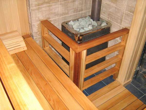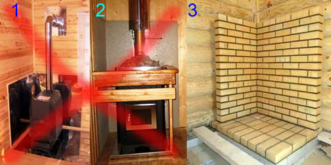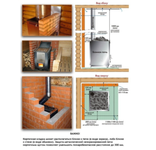 Les garde-corps métalliques pour le poêle dans le hammam sont installés sous la forme d'une boîte ou fixés dans le coin entre le poêle et le mur. La distance entre l'écran et le four doit être d'au moins 12 cm.