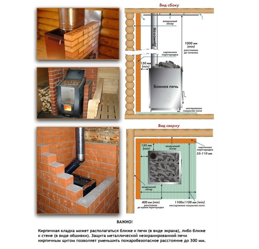 Lors de la pose de l'écran de protection, il est recommandé d'utiliser des briques en argile réfractaire. Le mortier est fabriqué à base d'argile ou de ciment. L'épaisseur de la maçonnerie peut être de 6 à 12 cm. La distance de la cloison au poêle doit être d'au moins 5 cm. La même distance doit être respectée entre les parois de la baignoire et l'écran.
