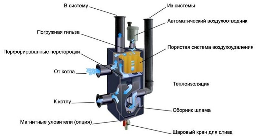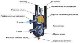 Extérieurement, le séparateur ressemble à un morceau de tuyau avec une section rectangulaire (moins souvent - circulaire) et deux bouchons à ses extrémités opposées. Cette conception est connectée à la chaudière avec de petits tuyaux et comporte plusieurs autres robinets sur le côté. En vente, il existe des produits de différentes formes et tailles avec un appareil simple. Mais il existe des modèles universels qui, selon leur destination, remplissent deux fonctions à la fois : un collecteur et un séparateur de flux.
