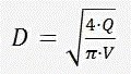 où D est le diamètre requis du produit, Q est la valeur moyenne du débit d'eau (m3 / s), π est la constante classique, et V est le débit du liquide dans le sens vertical (à un débit de 0,1 mètre par seconde).