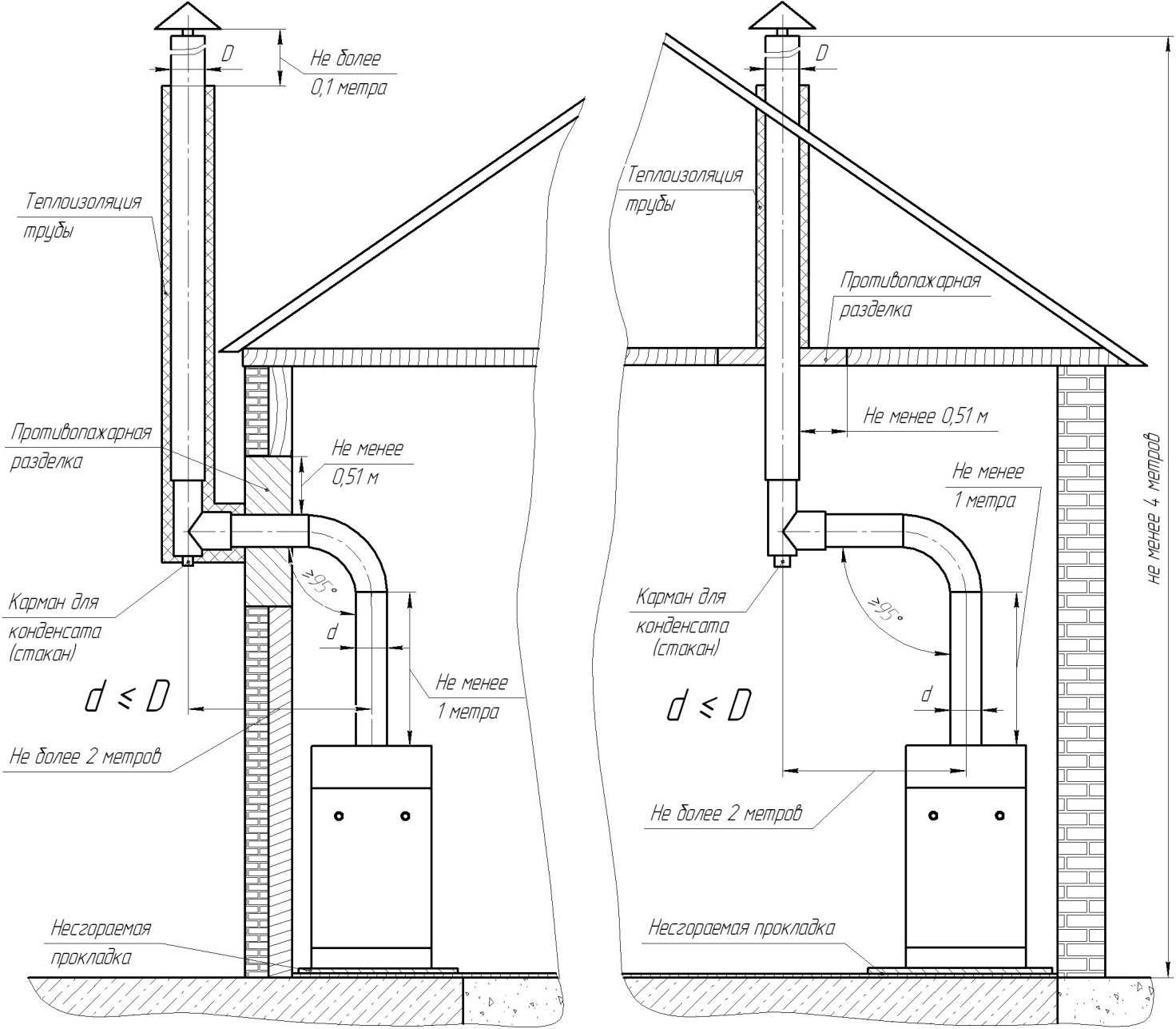 Si le toit est plat, la cheminée doit mesurer 1 mètre de haut. Si la structure du toit est combinée, le canal de fumée doit s'élever de 2 mètres au-dessus de sa surface.