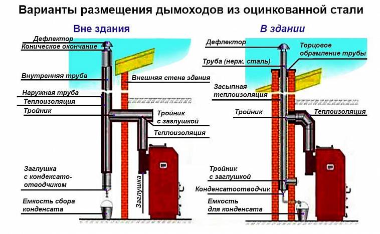 L'emplacement du tuyau doit être vertical. Lors de la conception d'une cheminée, il est préférable d'éviter les zones en pente. Si cela ne peut pas être réalisé, il est important de prendre en compte que la pente depuis l'emplacement vertical ne doit pas dépasser 30 ° et que la section doit rester dans les valeurs standard. La longueur de la section montée avec une pente ne doit pas dépasser la hauteur de la pièce.