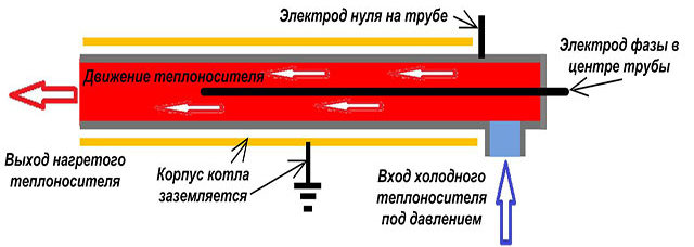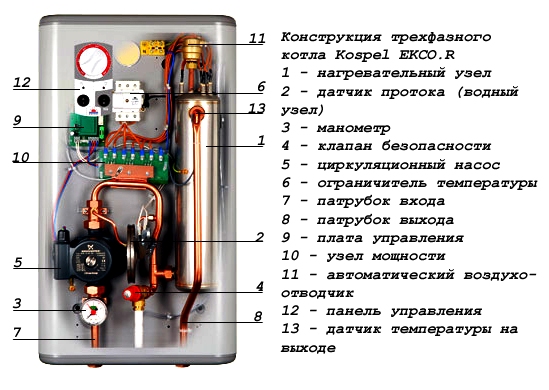 La conception de tous les types de chaudières électriques est réalisée selon le schéma général et se compose de composants structurels ayant le même objectif.
