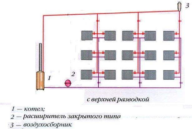 Une caractéristique de ce schéma est un tuyau auquel plusieurs appareils de chauffage sont connectés en parallèle. Cependant, cela conduit à une répartition inégale de la chaleur - plus le radiateur est éloigné de la chaudière, plus la température de l'eau qui y pénètre est basse. Pour résoudre ce problème, vous pouvez mettre à niveau le système de chauffage gravitationnel de type fermé :