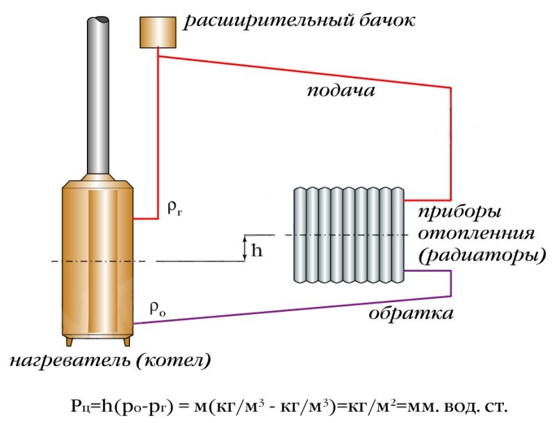 Lors du chauffage de l'eau dans l'échangeur de chaleur, elle se dilate, ce qui crée une surpression. À son tour, le caloporteur froid du tuyau de retour a une densité plus élevée et commence à déplacer le liquide à haute température. En conséquence, la circulation se produit.