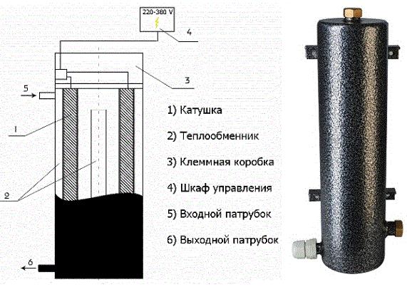La conception d'un tel dispositif a un boîtier en forme de cylindre. Un inducteur y est placé. L'échange de chaleur a lieu à l'intérieur et à l'extérieur. Le liquide pénètre dans le tuyau de dérivation, traverse l'échangeur de chaleur, se réchauffe et entre dans le circuit de chauffage.