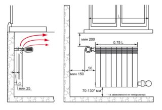 La distance entre le sol et le bord inférieur de l'appareil est choisie de 70 à 120 mm et au rebord de la fenêtre d'au moins 80 mm - c'est la solution optimale pour le transfert de chaleur. 30 - 50 mm en retrait du mur.