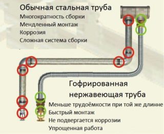 Un tuyau ondulé pour le chauffage détermine son objectif, car la surface a un transfert de chaleur élevé, des anneaux épais sur le tuyau peuvent servir de radiateur.