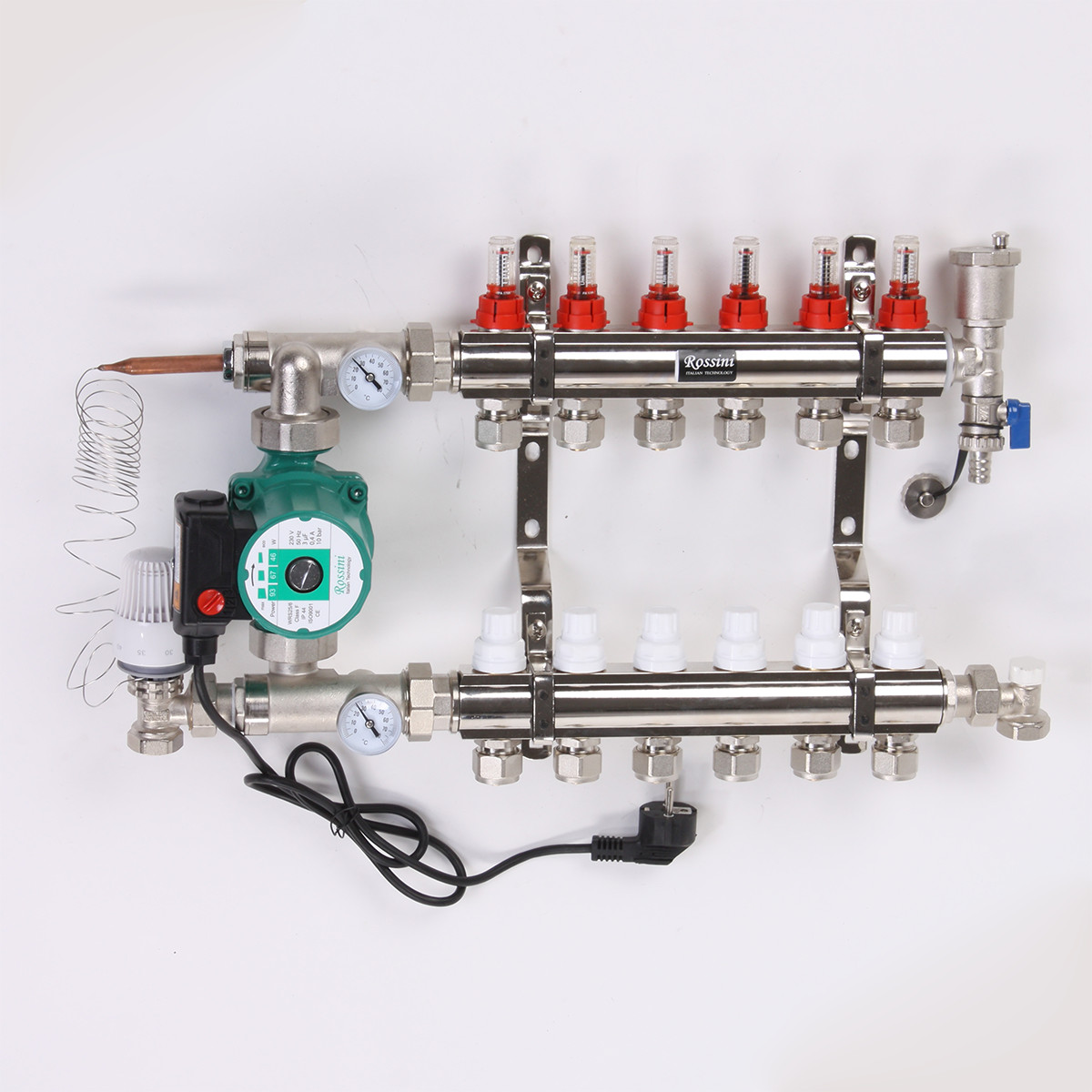 La température de chauffage est régulée par le capteur. Jusqu'à ce que le point de consigne soit atteint, la pompe fonctionne et les vannes thermostatiques sont ouvertes, à travers lesquelles l'eau chaude pénètre dans les tuyaux. Lorsque la température est à la température spécifiée, la pompe est arrêtée et les vannes sont fermées.