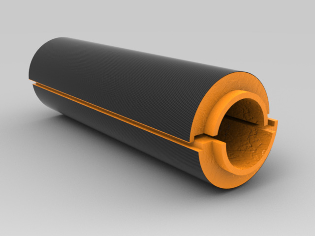 L'enveloppe des tuyaux est un cylindre cranté d'un côté ou des segments fixés entre eux selon le principe rainure-peigne. L'isolation sans rainures peut être fixée avec des pinces, du fil, de la colle. Après fixation, une enveloppe de protection est formée à la surface du tuyau.