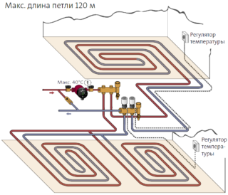 Avec un système combiné, il est possible de compenser le refroidissement des tuyaux, car les tuyaux sont situés en parallèle, grâce à quoi le mouvement du caloporteur chaud et refroidi est le même. Il est préférable de commencer cette option d'installation à partir des murs extérieurs ou les plus frais de la pièce.