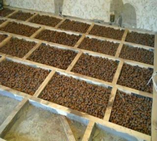 - Remblayage d'argile expansée. Pour la commodité d'effectuer le travail, il est préférable d'utiliser du matériel d'une fraction. L'isolant doit être uniformément réparti sur la surface de la base. Si les tailles des éléments sont différentes, un petit matériau est posé en premier.