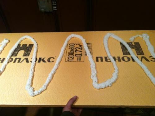 - Vérification de la qualité des joints. Les petites fissures sont soufflées avec de la mousse de polyuréthane, les grandes sont scellées avec des morceaux de mousse et de colle. L'excès de matériau est enlevé avec une spatule ou coupé avec un couteau au ras de la surface.