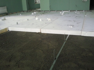 Une chape de finition est posée sur le dessus, d'une épaisseur approximative de 5 à 8 cm.Le ruban amortisseur doit nécessairement regarder vers l'extérieur, être au-dessus du niveau de la chape. Tous les défauts sont traités avec de la mousse de polyuréthane ou de la fibre de verre.