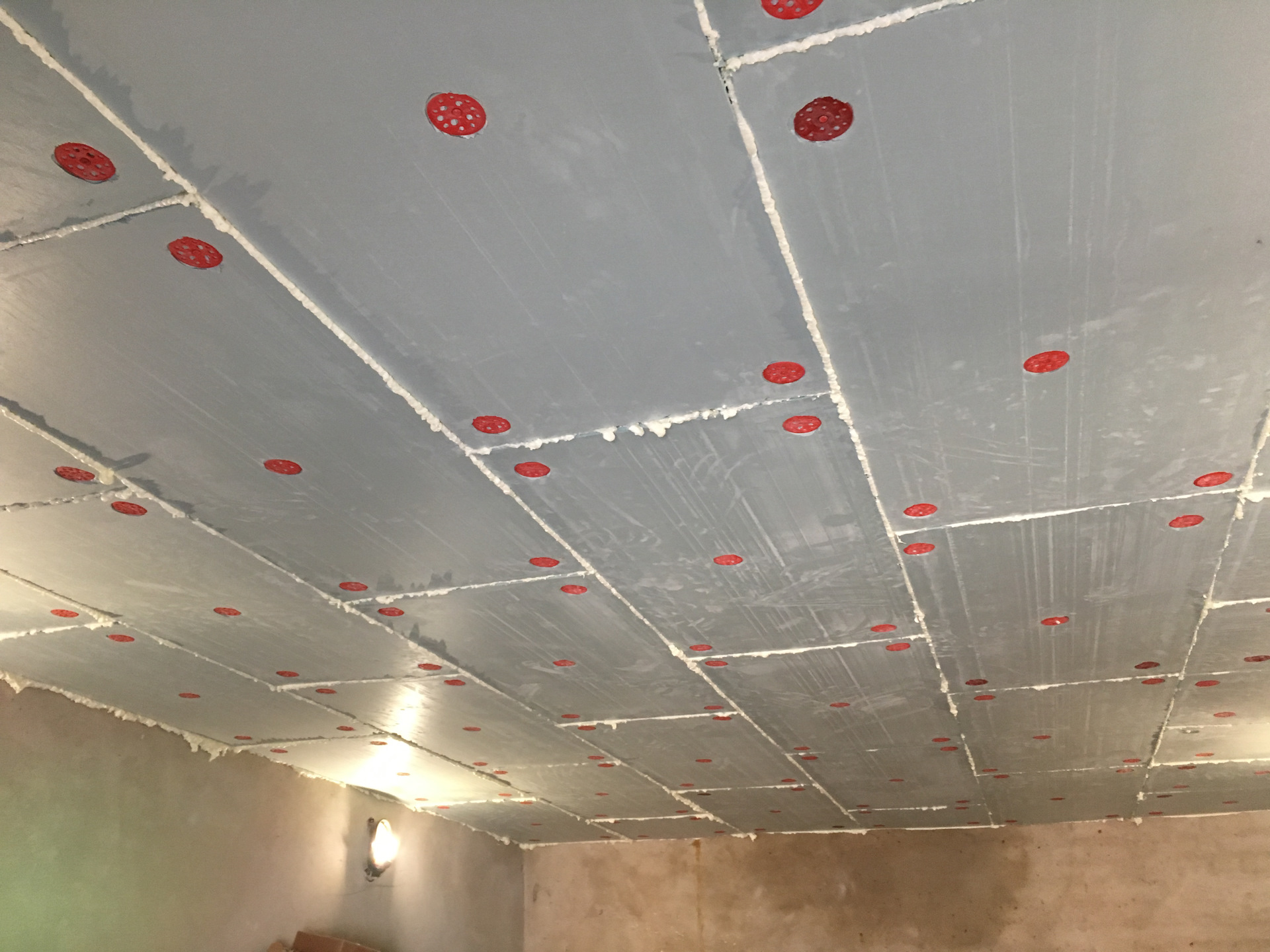 - Une chape de 4 à 8 mm avec renfort est réalisée. Pour éviter que la chape ne se fissure, il faut l'humidifier régulièrement avec de l'eau pendant 10 jours jusqu'à ce qu'elle sèche complètement.