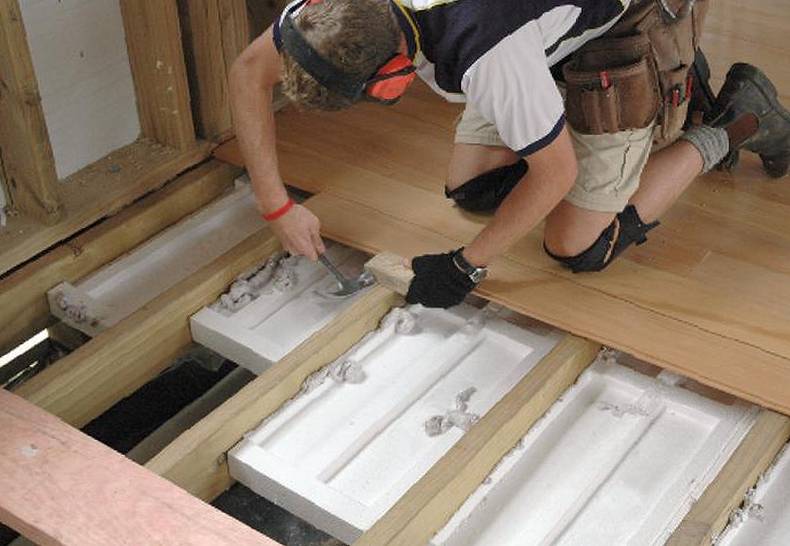 Une couche d'imperméabilisation est créée sur le sol. Des bûches de bois sont installées dessus, en tenant compte de la largeur de la feuille de mousse. Il est important de laisser un espace d'environ 20-30 cm près des murs.Tous les vides sont remplis de blocs isolants. Des feuilles d'aggloméré sont placées au-dessus du décalage. Les interstices sont scellés avec du mastic élastique.