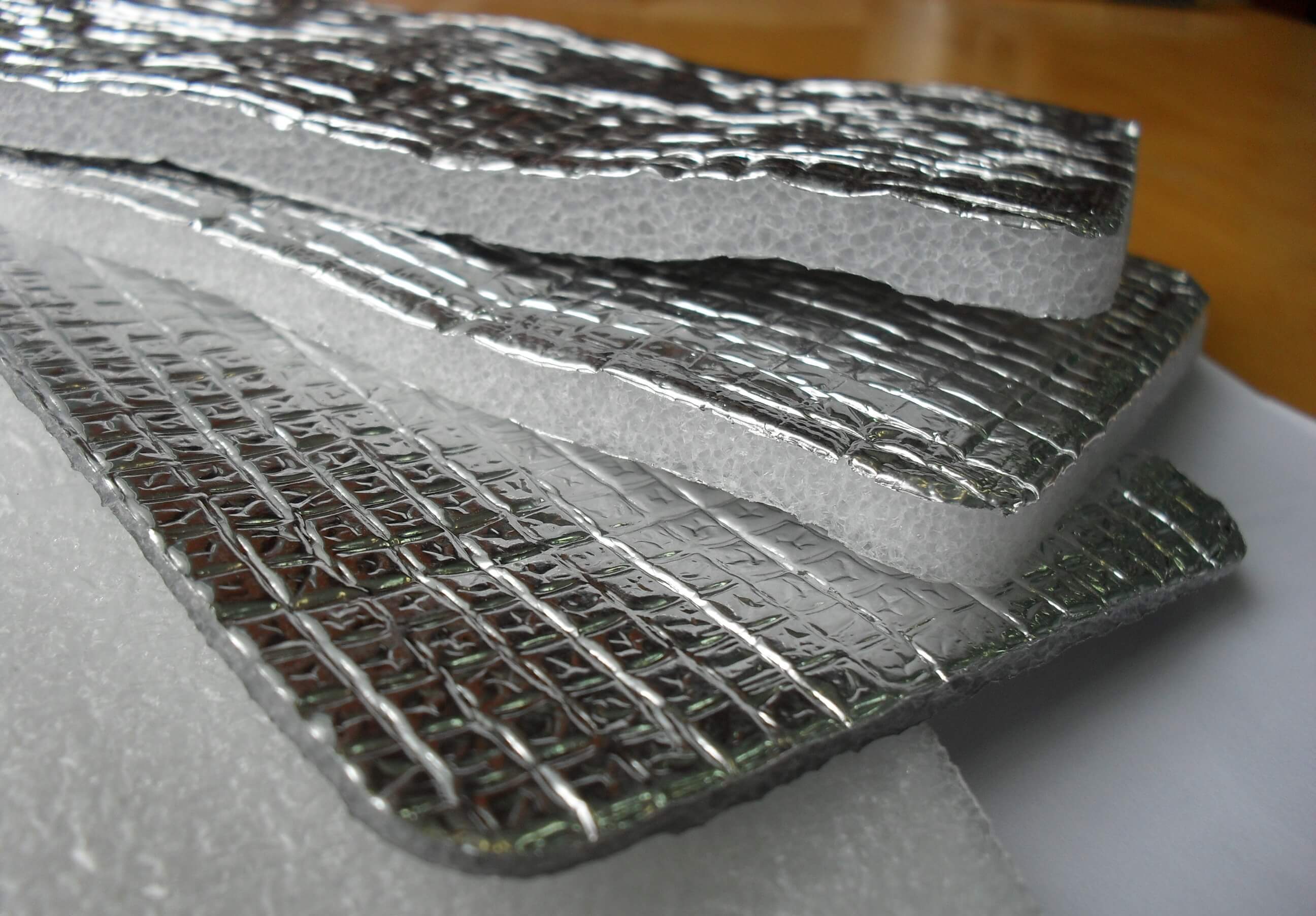 - Penoizol et penofol. Il est fabriqué sous forme de rouleaux, dont la base est de la mousse de polyéthylène, enfermée entre des couches de papier d'aluminium. La faible épaisseur du matériau lui permet d'être utilisé pour la décoration intérieure et extérieure avec un minimum d'excavation.