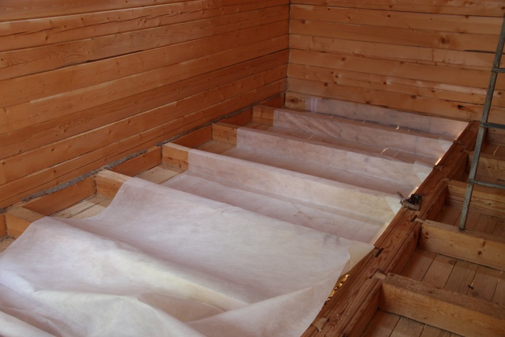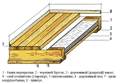 - Les bûches sont en bois de dimensions 50 × 180 mm. Ils doivent être posés sur une bande de fondation ou des pieux. La distance entre les décalages doit être égale à la largeur de l'isolant thermique.