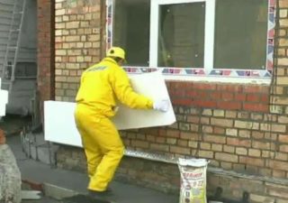 Pour les panneaux de béton, il est préférable d'utiliser du polystyrène, qui est planté avec de la colle et fixé avec des chevilles à disque. Ensuite, la surface est recouverte de treillis d'armature, de plâtre et recouverte de peinture acrylique.
