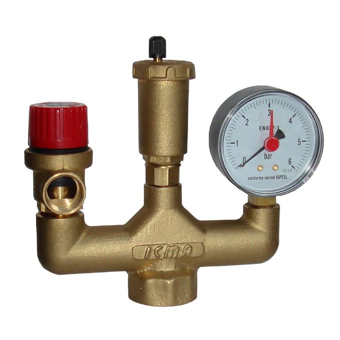 Il se compose de trois éléments - un évent, une vanne de vidange et un manomètre. Il est installé au point du système où les valeurs de température et de dilatation thermique de l'eau seront maximales - juste après la chaudière.