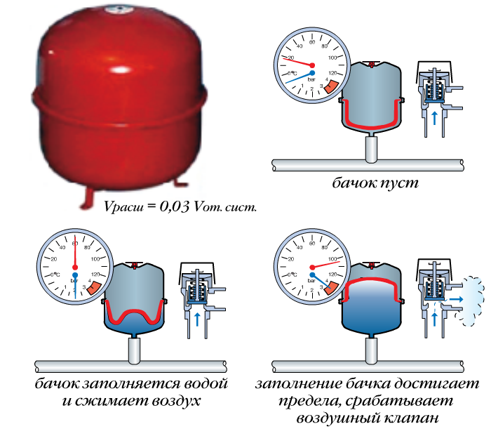 Il est conçu pour stabiliser la pression à ses petits écarts. S'applique également aux composants de chauffage dans une maison privée, qui sont conçus pour éviter les urgences.