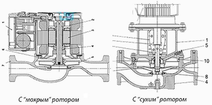 Les pompes de circulation modernes pour les chaudières de chauffage, conformément à leurs caractéristiques de conception, sont divisées en modèles "sec" et "humide". Leurs différences se manifestent dans la nature de l'interaction des éléments d'entraînement avec le liquide de refroidissement.
