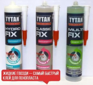 - Tytan Styro 753. La colle monocomposant est exclusivement destinée au travail avec des panneaux de polystyrène expansé. Il est à base de mousse de polyuréthane. Cette substance permet d'atteindre une vitesse de pose élevée de l'isolant. Le broyage du matériau est effectué dans les 2,5 heures suivant l'utilisation de la colle.