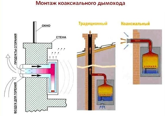 Ce type de cheminée est utilisé dans les chaudières qui prennent en charge la combustion ouverte du combustible. Lorsqu'une cheminée de poêle traditionnelle ne peut pas être utilisée pour diverses raisons, une cheminée coaxiale est installée. Pour des raisons de sécurité, il n'est pas recommandé de raccorder des chaudières à gaz à d'anciens canaux de four.