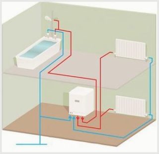 Dans les unités à double circuit, un échangeur de chaleur de structure différente est intégré. Un autre tuyau avec un liquide pour une alimentation en eau est inséré dans le tuyau à travers lequel passe le liquide de refroidissement. Les ruisseaux se déplacent dans une direction. À partir du gaz de combustion, l'énergie est d'abord transférée au remplissage du système de chauffage, et il chauffe l'eau à des fins domestiques.