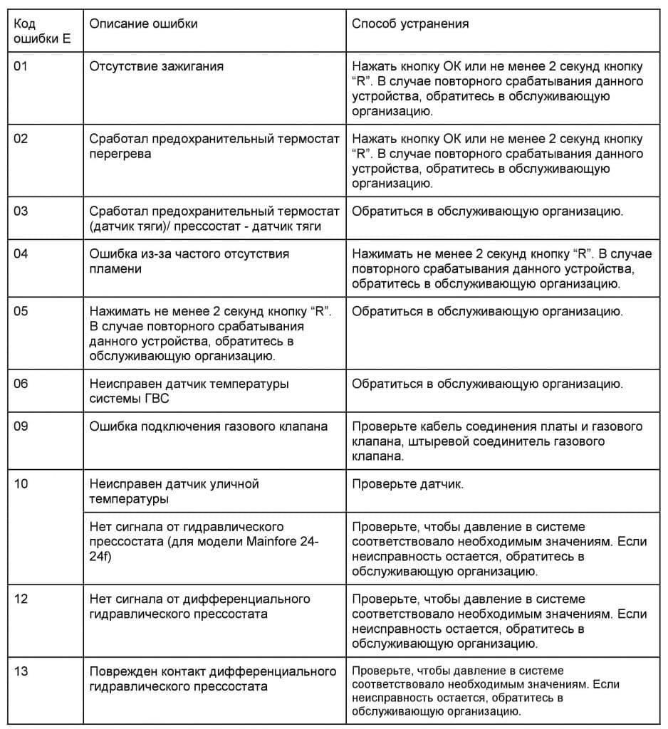 - Index E et numéros 01 - pas d'allumage. La connexion du capteur et l'alimentation en gaz sont vérifiées. Appuyez sur R et maintenez pendant 2-3 secondes.