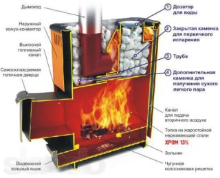 Le combustible brûle dans la chambre de combustion d'un poêle de sauna, ce qui entraîne la formation de cendres, de substances volatiles et d'énergie thermique. Le corps de la structure chauffe les objets et les surfaces de contact. Ils chauffent à leur tour la pièce par convection. La chaudière a un principe de fonctionnement différent. La chambre brûle également du carburant et génère de l'énergie, mais sa distribution est due à la circulation de l'air.
