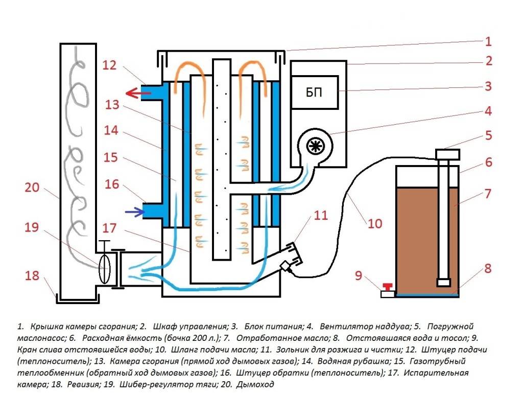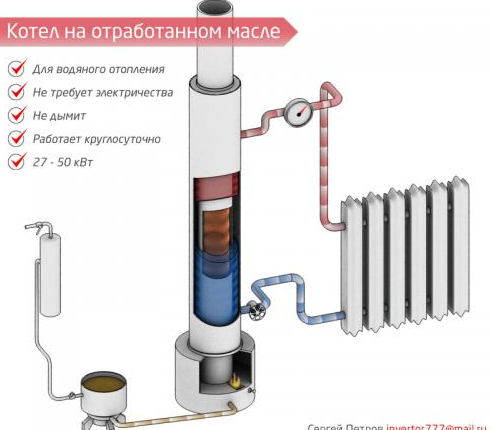 Une chaudière à fiouls usagés avec un circuit d'eau est un équipement de chauffage par le sol fonctionnant sur un combustible inhabituel, sous la forme d'un épuisement. L'appareil est plus économique que ses homologues à gaz. La conception sera le meilleur choix pour fournir de la chaleur aux maisons privées, où il est coûteux d'utiliser l'électricité pour le chauffage et où la conduite de gaz n'est pas fournie ou est encore en cours de développement. La chaudière résoudra le problème du chauffage de grandes surfaces à partir de 600 mètres, économisera de l'argent pour les personnes qui ont librement accès à de grands volumes d'huile usée.