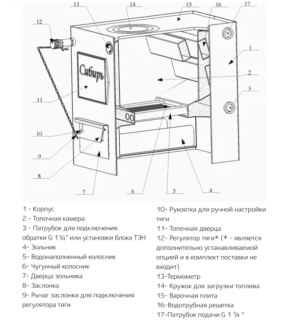 À y regarder de plus près, il convient de prêter attention à la grille, aux traverses et au couvercle. Toutes les chaudières sibériennes sont créées à l'aide d'une technologie universelle et se composent presque des mêmes éléments. La grille est conçue pour augmenter la surface du volume thermique et obtenir un effet maximal. Des poutres sont placées sur le trajet de circulation des fumées afin de diriger la chaleur dans le système de chauffage. Les couvercles sont complétés par des trous pour le charbon de bois et ont une forme standard.