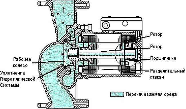 Les pompes assurent le pompage de grands volumes de liquide de refroidissement en l'absence de contact entre le rotor et l'eau. Le corps est en fonte ou en acier, recouvert de composés anticorrosifs. Il y a un joint sous forme de bagues statiques et dynamiques entre le moteur et le groupe motopompe. La différence entre les pompes à rotor sec est de 85 % d'efficacité.