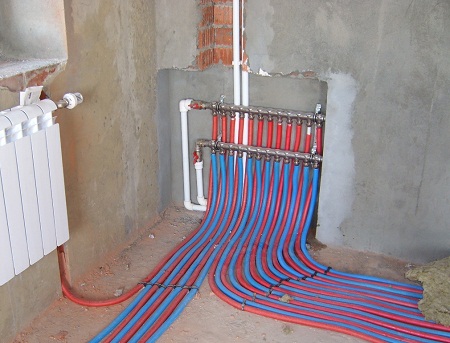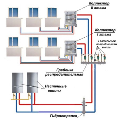 Un collecteur d'alimentation et de retour est installé près de la colonne montante du système à deux tuyaux. À partir d'eux, sous les planchers, des tuyaux sont dirigés vers chaque radiateur installé sur le sol.