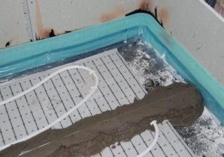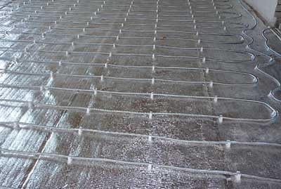 - Pose des éléments chauffants. La procédure est effectuée selon un schéma préalablement établi, en tenant compte de l'emplacement des meubles et des appareils ménagers dans l'appartement. La nuance est que les contours doivent être fermement fixés sur la base afin qu'ils ne flottent pas, car la solution de béton a une densité et une densité élevées.