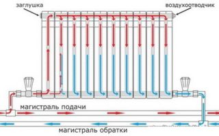 Le schéma prévoit l'organisation du retour par le bas d'un côté et l'alimentation par le haut de l'autre. La technologie diagonale est mise en œuvre pour les batteries sectionnelles à partir de 12 cellules et les batteries de panneaux à partir de 120 cm.La méthode assure un chauffage uniforme des appareils dans la zone la plus éloignée de la ligne principale.