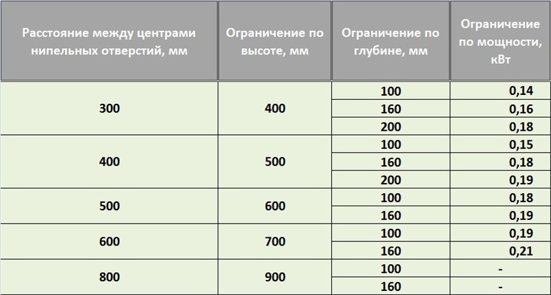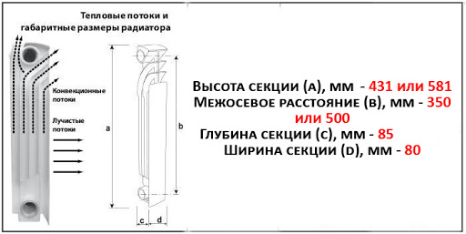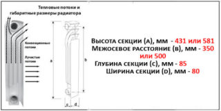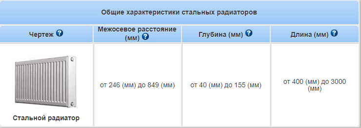 La distance entre les centres des raccords de radiateur est de 300 ou 500 mm. La profondeur de la section du produit est de 40 à 115 mm. L'épaisseur de l'acier ne dépasse pas 1,5 mm.
