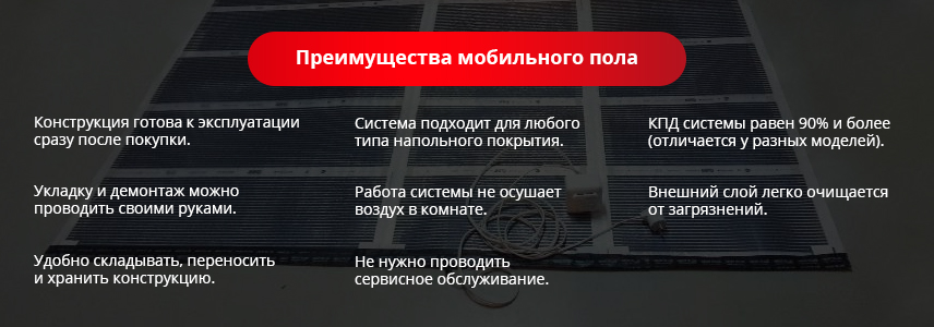 Un sol portable chaud ressemble en partie à un analogue fixe familier, mais nécessite en même temps moins de coûts d'entretien et d'installation. Le sol mobile ne nécessite pas la pose d'un revêtement de sol, la pose d'une nouvelle couche d'étanchéité, ainsi que le coulage de la chape. Il suffit de le répartir sur le périmètre de la pièce, de régler la température au niveau souhaité et de le connecter au réseau. Selon le type d'élément chauffant et le mode de chauffage, ces sols peuvent être infrarouges ou résistifs.