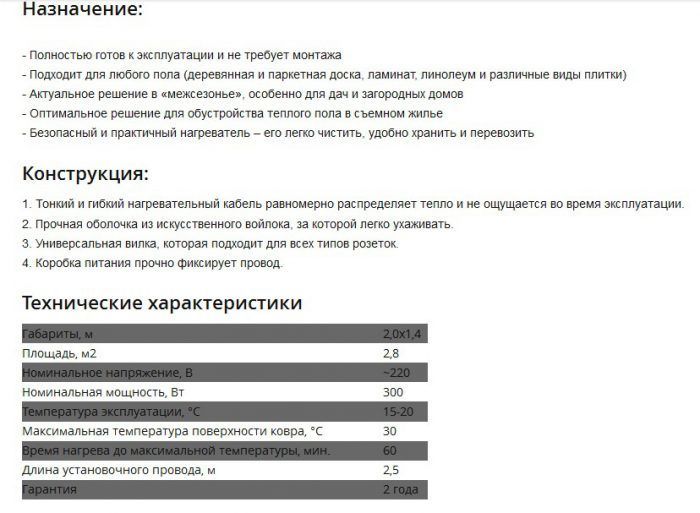 Les tapis ne peuvent être installés que sur une surface plane, les rainures et les fissures peuvent provoquer une panne de l'équipement. Les meubles et les objets d'intérieur ne sont pas placés sur le revêtement fini, sinon l'appareil surchauffera. L'équipement cinématographique doit être connecté au secteur séparément des autres appareils, tandis que le système doit avoir un appareil intégré avec un fusible. Les tapis mobiles ne sont utilisés que sous forme dépliée, ils ne peuvent pas être pliés en plusieurs couches.