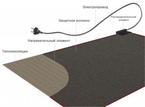 Un plancher calorifuge mobile sous un revêtement ou un tapis est une pièce électrique chauffante, qui est située dans un film souple avec un niveau de résistance thermique accru. Un produit de ce type est capable de chauffer au maximum jusqu'à 55 degrés, c'est l'indicateur optimal sans danger pour l'homme. La construction d'un plancher mobile comprend les éléments suivants :