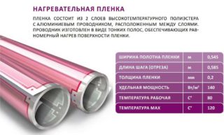 Un sol en film est produit sous forme de bandes de 50 à 100 cm de large et d'une longueur totale allant jusqu'à 50 m. La découpe en fragments de la longueur requise est effectuée en fonction des marques appliquées sur le matériau. Selon le fabricant et le modèle, l'épaisseur de la bande est de 0,25 à 0,48 mm avec une consommation électrique de 25 à 35 kW / h par mètre courant.