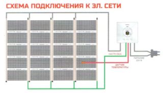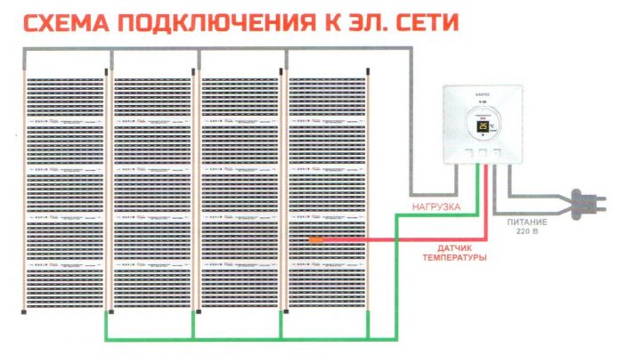 - Fourniture et raccordement du câble d'alimentation et du thermostat. Il est conseillé de briquer le câble dans un portail, et le régulateur dans un boîtier de montage interne (prise). Si cela n'est pas possible, une boîte en plastique externe est utilisée. Ensuite, le sol en film est allumé et testé.
