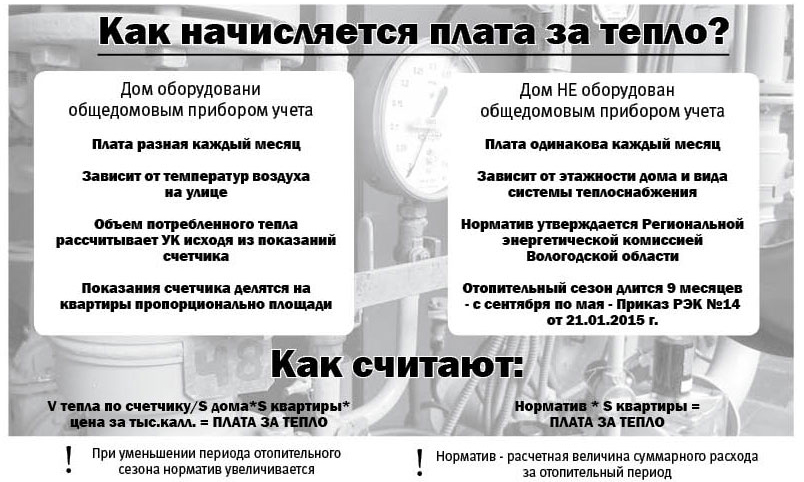 Pour tenir compte de la quantité de chaleur que les utilisateurs domestiques ont pu consommer, des normes de chauffage à l'échelle de la ville par mètre carré sont appliquées. En 2019, le gouvernement a établi de nouvelles normes de comptabilisation de la consommation de chaleur pour le chauffage des locaux techniques et la ligne «besoins généraux du bâtiment» est apparue dans le reçu.