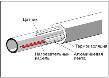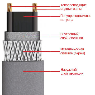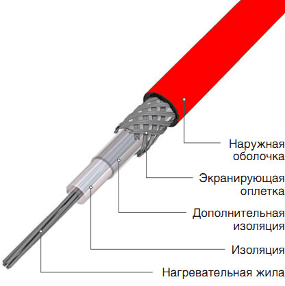 Pour chauffer le système d'alimentation en eau, des systèmes constitués d'un ou de deux conducteurs internes sont utilisés. Dans les produits monofilaires, le noyau agit à la fois comme un élément chauffant et comme une ligne. Dans les câbles à deux conducteurs, un fil chauffe et l'autre fournit de l'énergie.