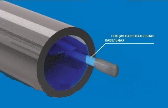 - Intérieur. Cette option peut être utilisée pour les tuyaux d'un diamètre de 25 mm ou plus. Des modèles monocœur résistifs et autorégulants peuvent être utilisés. Ceci est dû au fait que l'emplacement adjacent du câble provoque une induction et des dysfonctionnements du produit, jusqu'à et y compris la panne. La complexité de cette méthode réside dans la difficulté de tirer le fil dans le canal. Il est préférable de le faire même au stade de l'installation, en poussant le câble dans des sections disposées verticalement ou en utilisant un câble de traction.